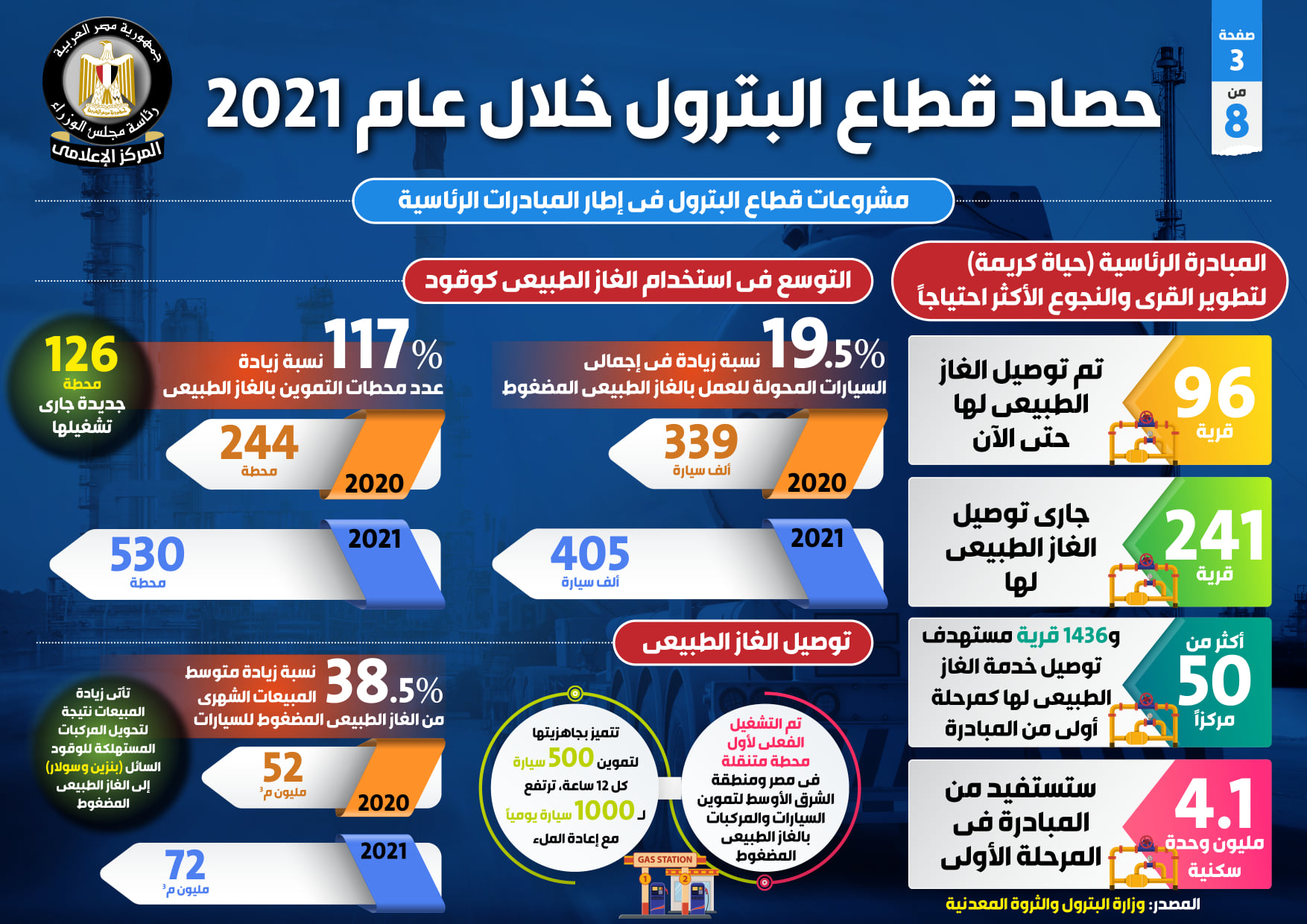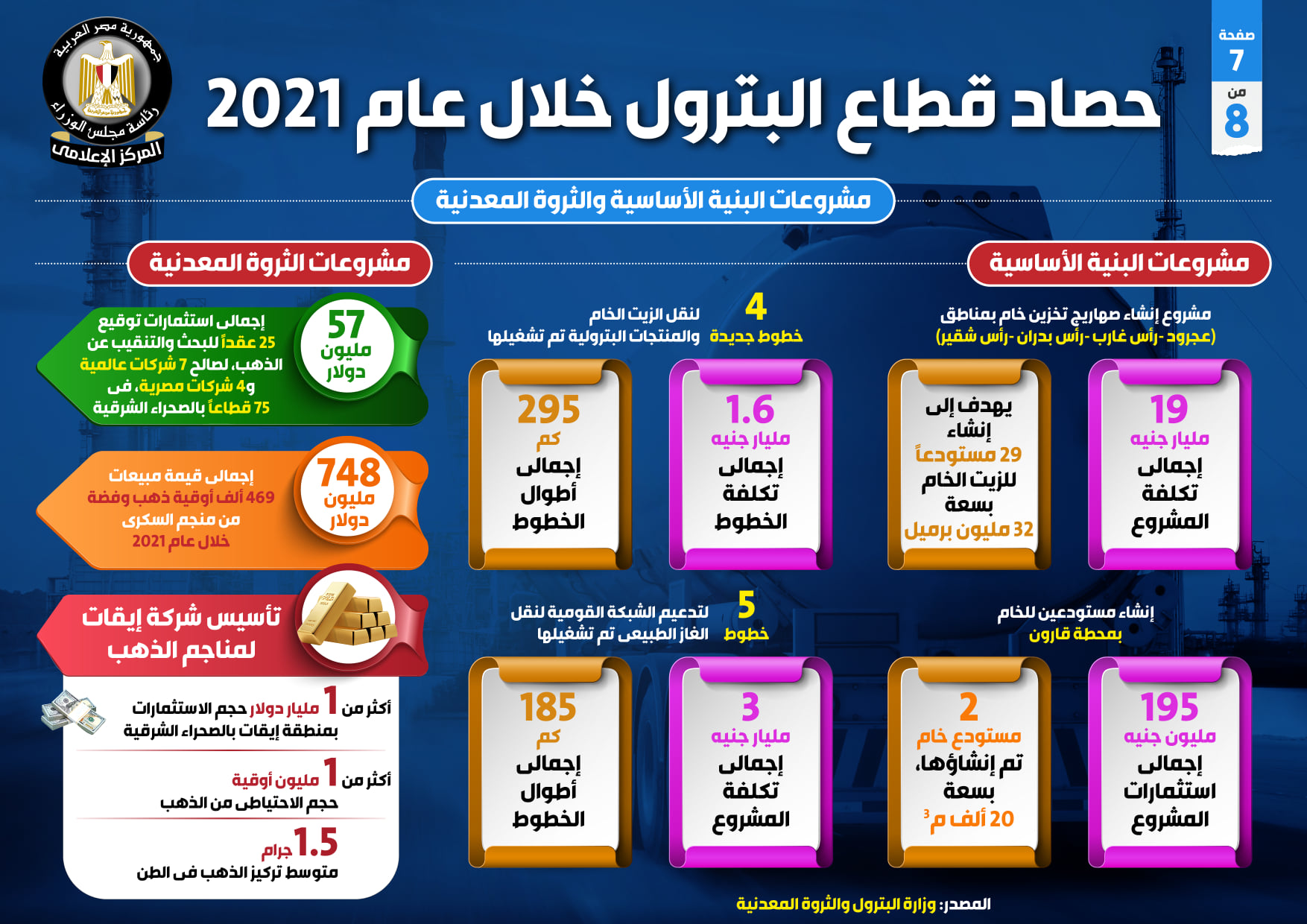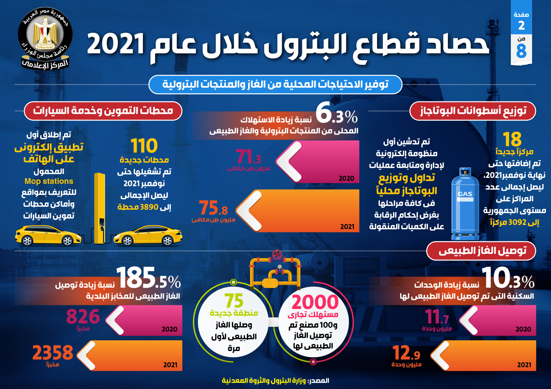 وفي إطار سلسلة تقارير حصاد قطاعات الدولة في عام 2021، نشر المركز الإعلامي لمجلس الوزراء تقريراً تضمن إنفوجرافات تسلط الضوء على حصاد قطاع البترول.