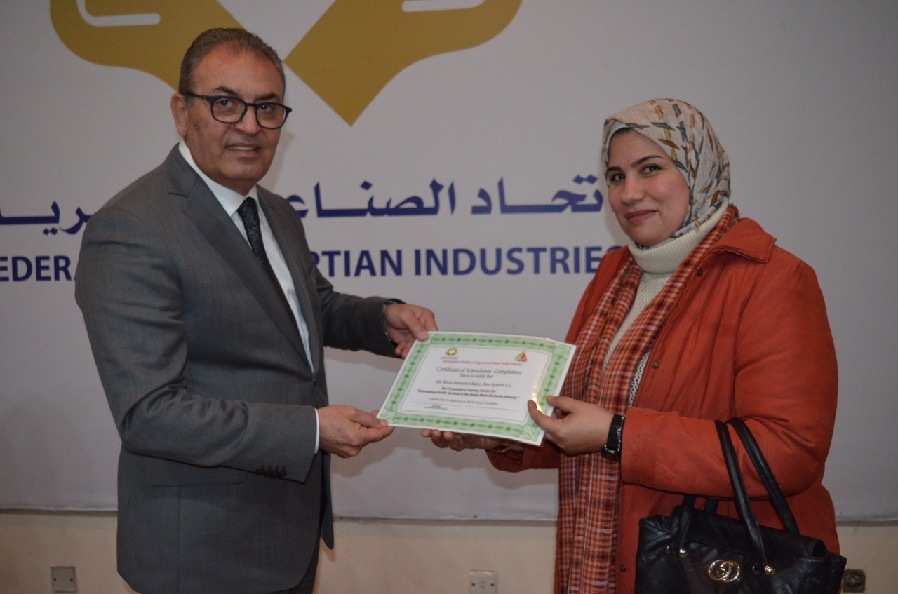 قام الدكتور محمد عبد السلام رئيس مجلس ادارة غرفة صناعة الملابس الجاهزة والمفروشات باتحاد الصناعات بتوزيع شهادات التقدير علي عدد من العناصر المتميزة في الدورات التدريبية التي نظمتها الغرفة وشملت مجالات الانتاج والجودة والتأهيل للتصدير والموارد البشرية واللوجستيك ومهارات التصدير والافراج الجمركي والتسجيل المسبق للشاحنات ومتابعةخطوط السير للملاحة وقد شارك فيها 148 متدرب من 50مصنع ملابس في محافظات القاهرة الكبري والاسكندرية ومن المخطط استهداف تنظيم دورات لمصانع القطاع في مدن القناة والمحلة الكبري خلال الشهور القادمة .