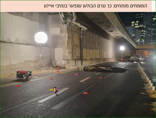 أدى إنهيار أرضي اليوم في تل أبيب إلى فتح حفرة في ممرات أيالون الجنوبية بالقرب من مفترق السلام .وقد تسبب في حالة من الفزع وزحام مروري شديد وإغلاق كامل لجنوب أيالون من جاليت إلى تقاطع السلام خلال الليل.