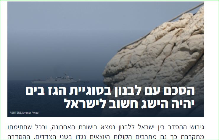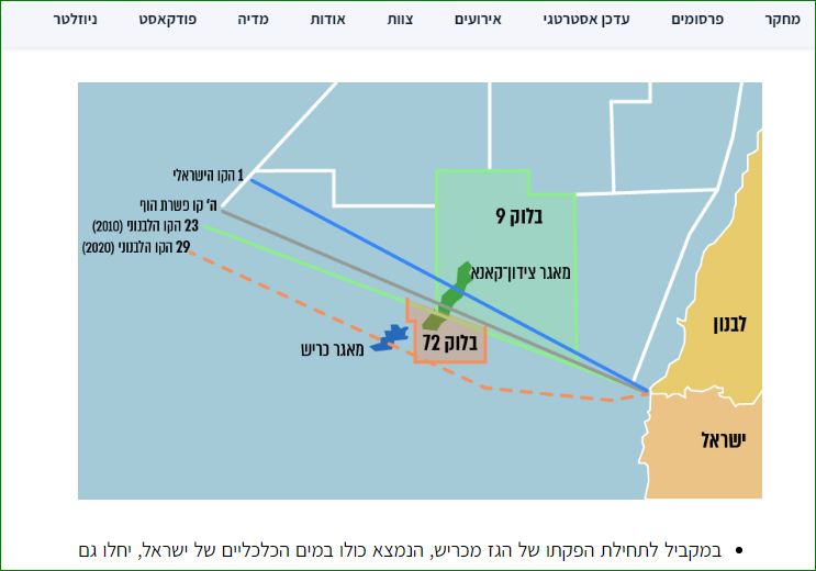 صدر مؤخر عن معهد دراسات الأمن القومي الإسرائيلي تقرير للباحثة أورنا مزراحي حول الاتفاق المزمع توقيعه بين الجانب اللبناني وإسرائيل لتسوية أزمة ترسيم الحدود البحرية وحقول الغاز .. تحدثت فيه الباحثة عن ثلاث مكاسب إسرائيلية في حالة تنفيذ الاتفاق ( اقتصادي - أمني - استراتيجي ) ونتعرض هنا للجانب الاستراتيجي في دراسة مزراحي ثم سنقوم بنشر المكاسب الإسرائيلية في الجانب الاقتصادي والأمني تباعا: