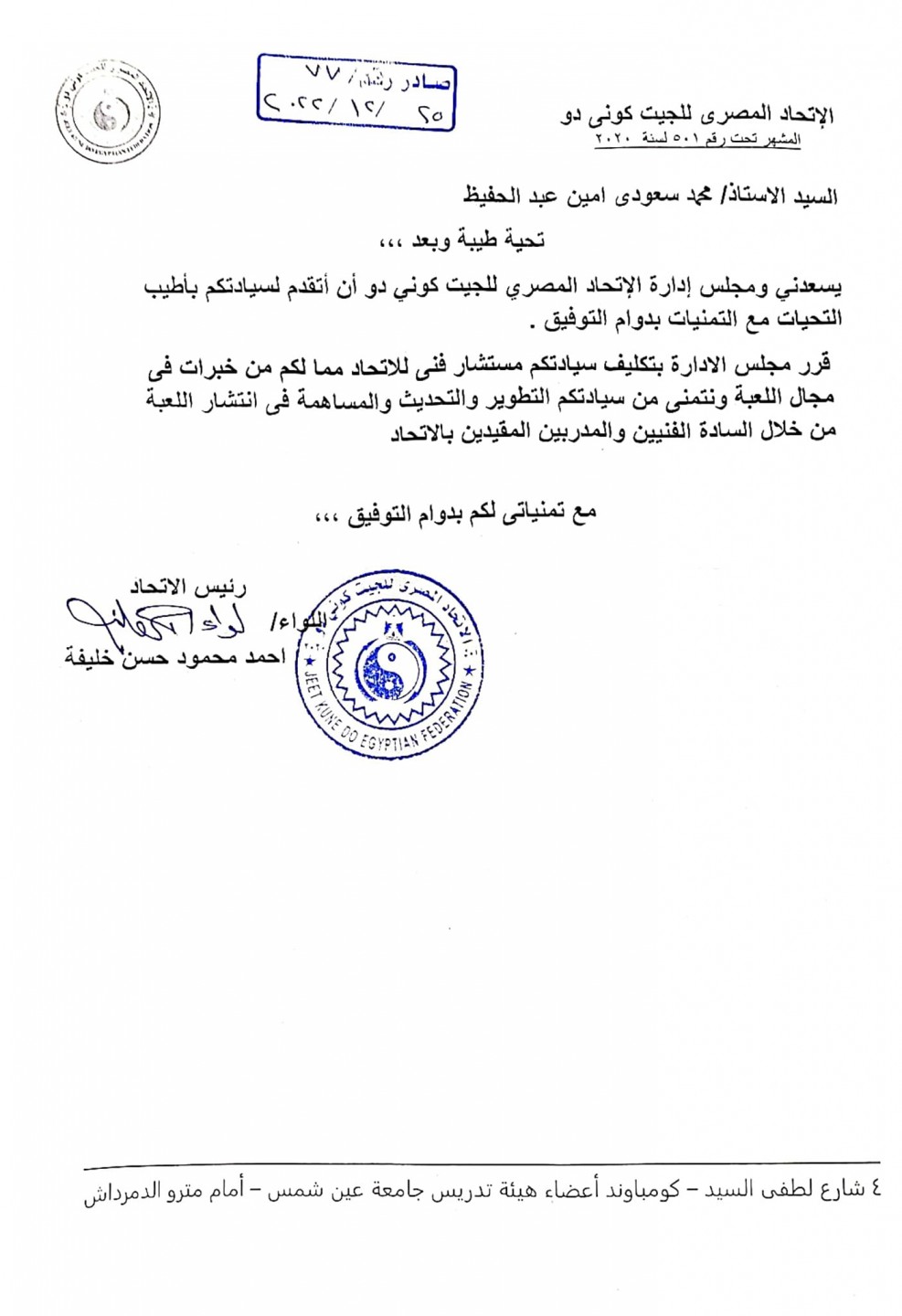 أصدر مجلس إدارة الاتحاد المصرى للجيت كون دو قرارا بتكليف الكابتن محمد سعودي رئيس الاتحاد الدولى للمنازلات المائية "مستشارًا فنيًا للإتحاد المصرى للجيت كون .