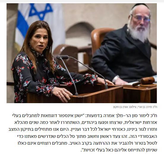 وقالت عضو الكنيست ليمور سون هار مالك وهي تبكي: "هناك أمثلة لا حصر لها من الإرهابيين الذين يحملون الجنسية الإسرائيلية ، الذين قتلوا اليهود وأذواهم ، وأطلق سراحهم بعد بضع سنوات من السجن وعادوا للعيش بيننا ، كمواطنين إسرائيليين لجميع النوايا و المقاصد.