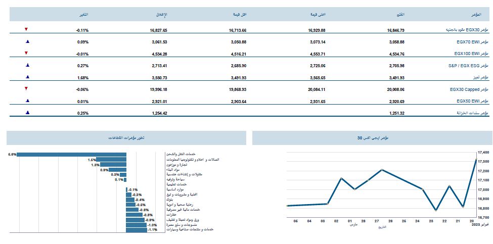 أغلق مؤشر ايجى اكس 30 عند 16,827.65 نقطة, مسجلا انخفاضا بنحو 0.11 %. بينما سجل مؤشر