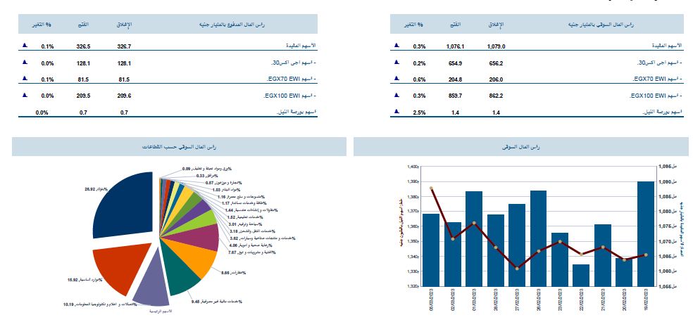 بلغ إجمالي القيمة السوقية 1,079.0 مليار جنيه في نهاية اليوم مما يمثل ارتفاعا بنحو 0.27 % خلال اليوم