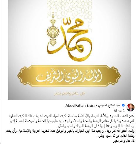 توجه السيد الرئيس عبد الفتاح السيسي اليوم بتهنئة للشعب المصري والأمة العربية والإسلامية بمناسبة المولد النبوي الشريف ، وذلك عبر صفحته الرسمية على الفيس بوك وعلى موقع الرئاسة الرسمي .