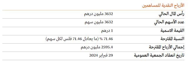 أوصى مجلس الإدارة لـ مصرف أبوظبي الإسلامي، الذي عقد اليوم الموافق 23 يناير 2024، بتوزيع أرباح نقدية للمساهمين بنسبة 71.46% (ما يعادل 71.46 فلس/للسهم) من رأس المال عن عام 2023، كما يوضح الجدول التالي: