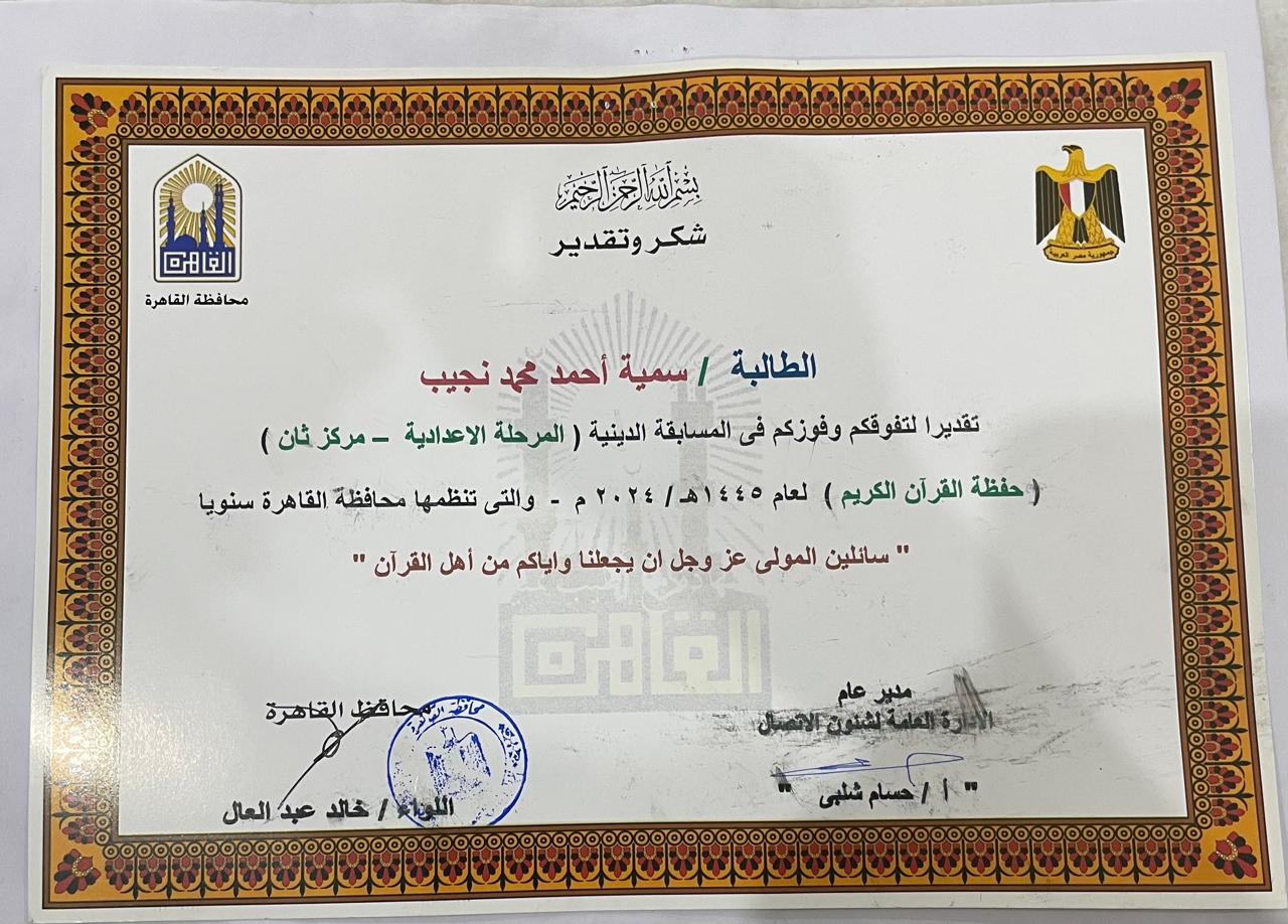 كرّم اللواء خالد عبد العال، محافظ القاهرة، الطالبة سمية أحمد محمد نجيب، تقديرًا لتفوقها في المسابقة الدينية وحصولها على المركز الثاني - المرحلة الاعدادية في مسابقة حفظة القرآن الكريم 1445هـ - 2024م التي تقيمها المحافظة سنويًا، بالتعاون مع مديرية التربية والتعليم ومديرية الأوقاف بديوان عام المحافظة.