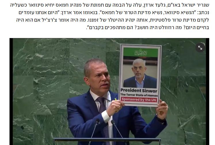 صعد سفير الاحتلال الإسرائيل لدى الأمم المتحدة، جلعاد إردان، إلى المنصة بصورة لزعيم حماس يحيى السنوار مع عبارة: "الرئيس السنوار، رئيس دولة حماس الإرهابية، قال إردان في كلمته: "اليوم نحن ذاهبون". للترويج لدولة الإرهاب الفلسطينية، والتي سيقودها هتلر عصرنا ماذا سيقول تشرشل لو كان على قيد الحياة اليوم؟ ماذا سيفكر روزفلت؟ إنهم يتقلبون في قبورهم".