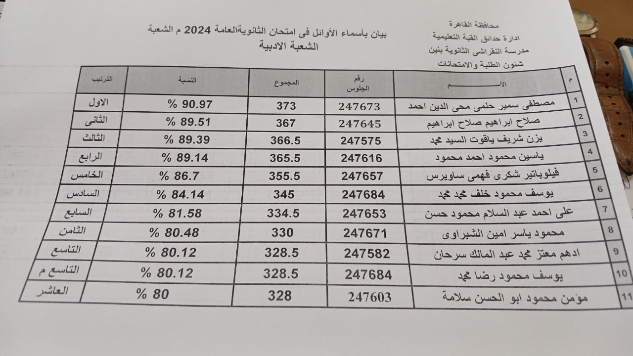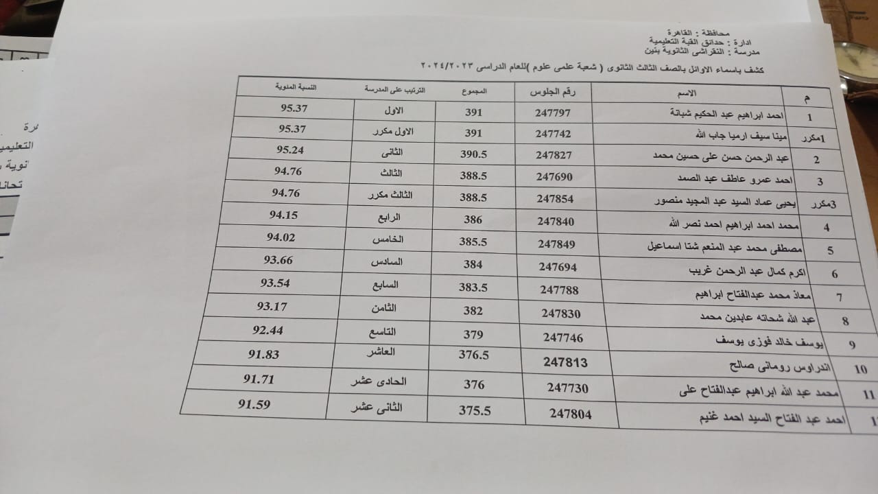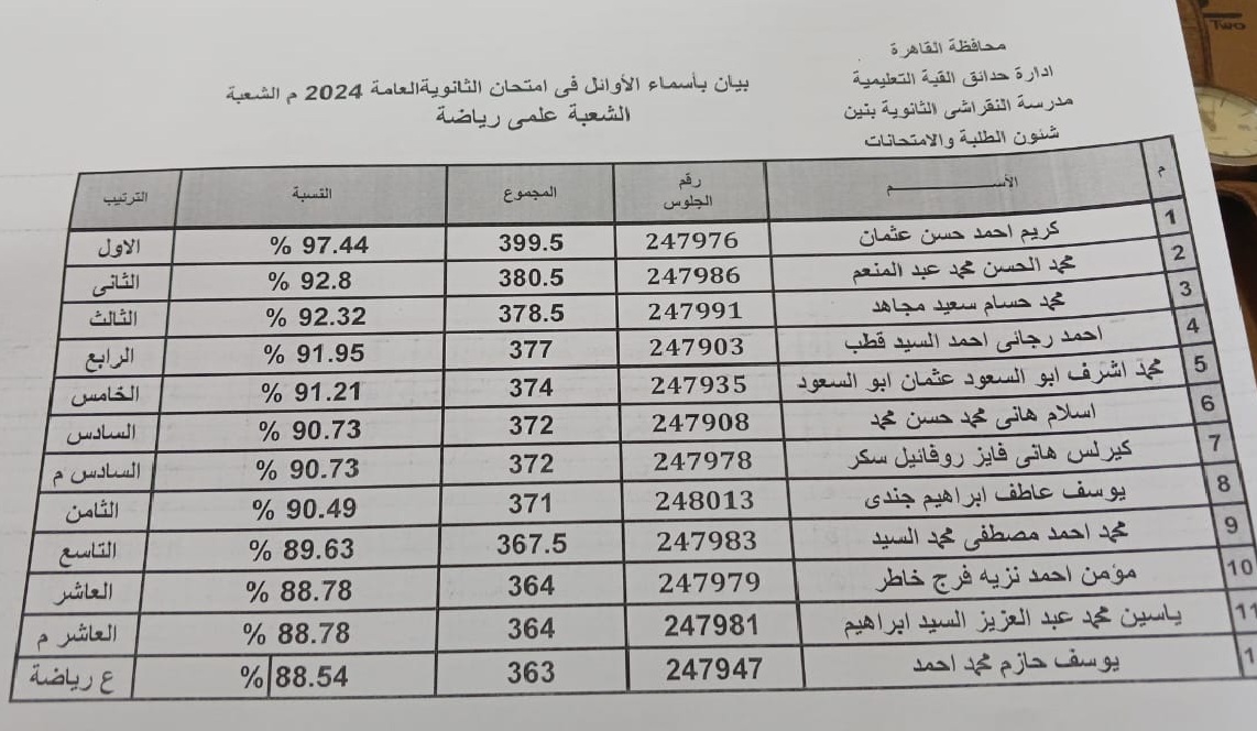 يتقدم الأستاذ عادل الحداد مدير مدرسة النقراشى الثانوية العسكرية بإدارة حدائق القبة التعليمية وهيئة التدريس بالمدرسة بأرق أجمل واسمى التهاني القلبية لأبناء المدرسة الذين حصلوا على أعلى الدرجات على مستوى الإدارة التعليمية بحدائق القبة متمنين لهم دوام التوفيق دائما