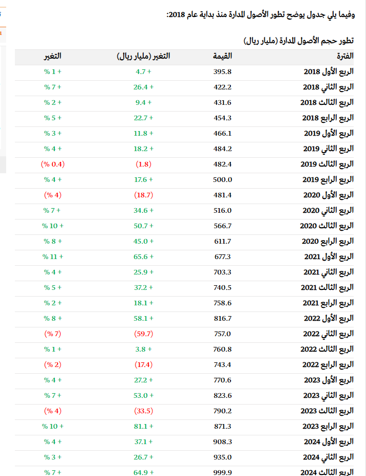 ووفقًا لبيانات الهيئة، بلغ حجم الأصول المدارة لدى مؤسسات السوق المالية في ممارسة نشاط الإدارة بنهاية الربع الثالث 2024 نحو 999.9 مليار ريال، بارتفاع نسبته 7% ما يعادل 64.9 مليار ريال، مقارنة بالربع الذي سبقه.