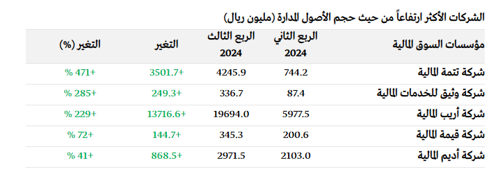 وتصدرت شركة تتمة المالية قائمة أكثر الشركات ارتفاعًا من حيث حجم الأصول المدارة بنسبة 471% خلال الربع الثالث 2024، تلتها شركة وثيق للخدمات المالية بنسبة 285%.