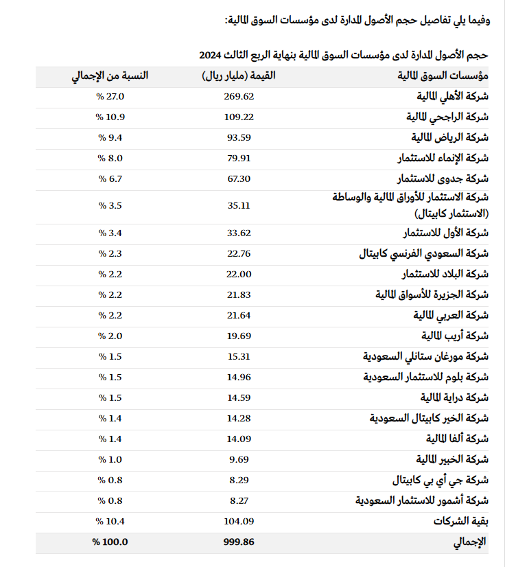 وتصدرت شركة الأهلي المالية قائمة مؤسسات السوق المالية من حيث حجم الأصول المدارة بنحو 269.6 مليار خلال الربع الثالث 2024، تمثل ما نسبته 27% من القيمة الإجمالية، تلتها شركة الراجحي المالية بنحو 109.2 مليار ريال.