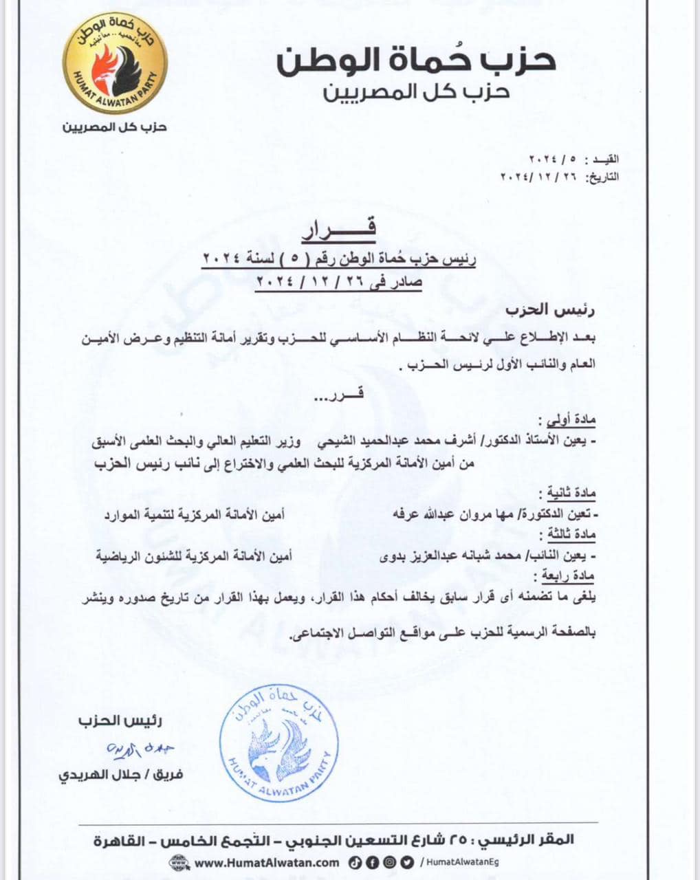أصدر الفريق جلال الهريدى رئيس حزب حماة الوطن قرار اليوم بتعيين الكاتب الصحفي والناقد الرياضي .. عضو مجلس الشورى الأستاذ محمد شبانه "أمين الأمانة المركزية للشئون الرياضية ".