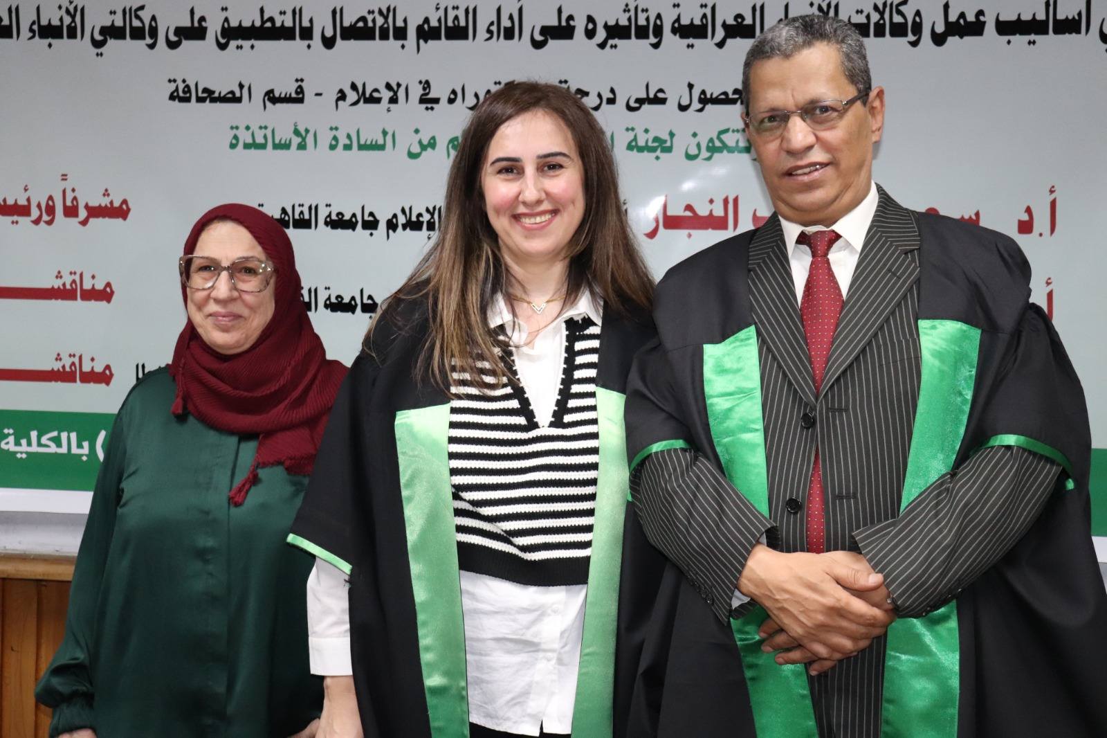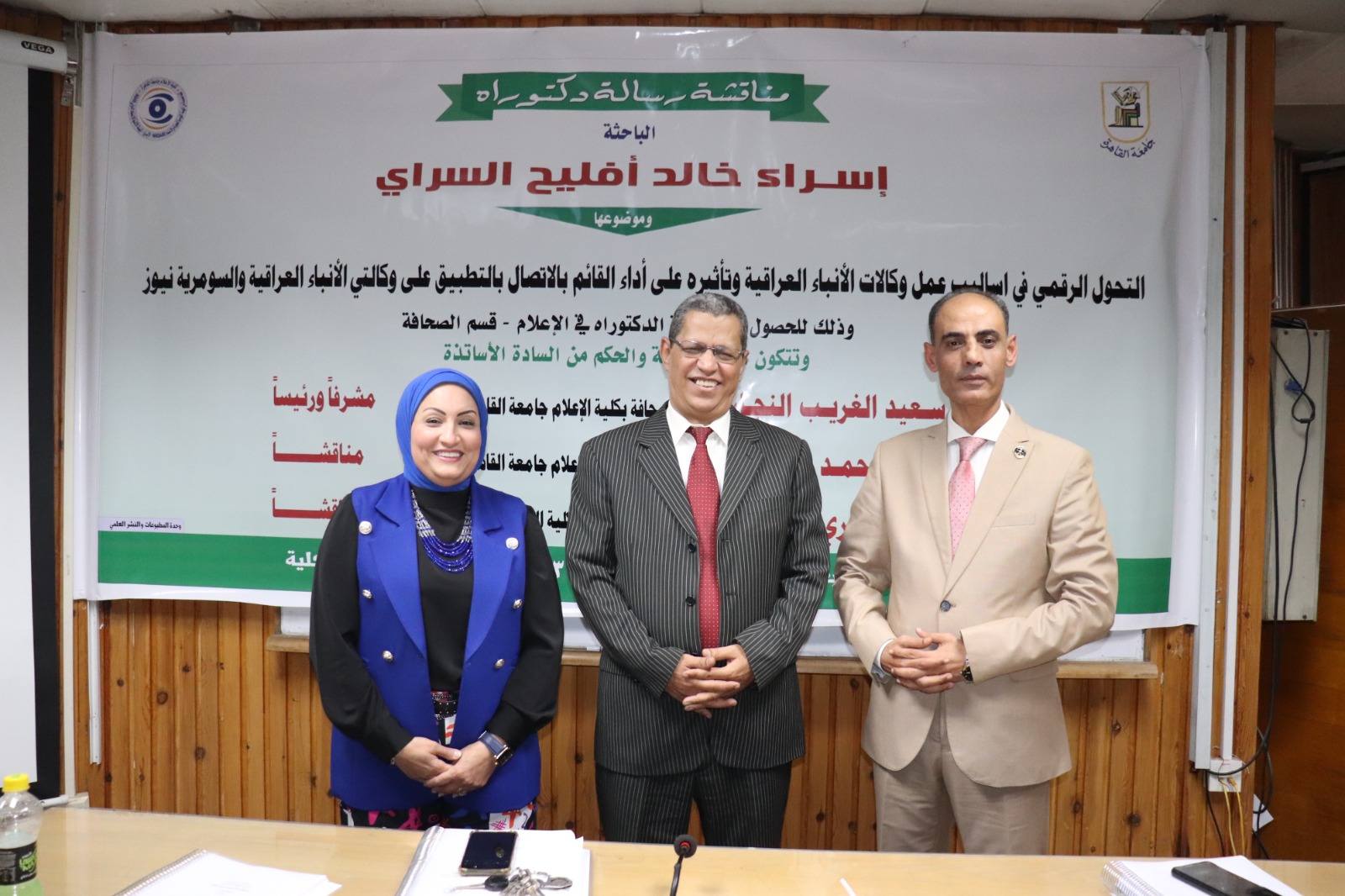 تمت اليوم بكلية الإعلام جامعة القاهرة مناقشة الباحثة العراقية (إسراء خالد إفليح ) في رسالتها للدكتوراة بعنوان( التحول الرقمي في أساليب عمل وكالات الأنباء وتأثيره على أداء القائم بالاتصالبالتطبيق على وكالتي الأنباء العراقية والسومرية نيوز).