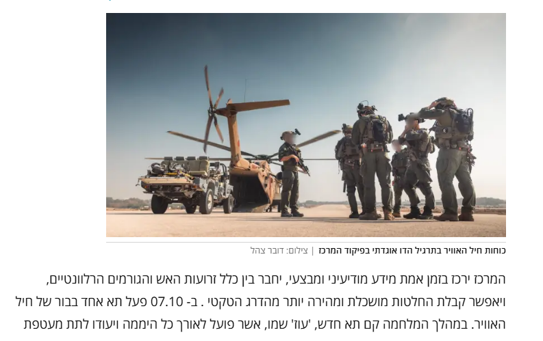 في 7 أكتوبر، كانت خلية واحدة تعمل في ملجأ تابع للقوات الجوية. خلال الحرب، تم إنشاء خلية جديدة، أُطلق عليها اسم "أوز"، تعمل على مدار الساعة وتهدف إلى توفير تغطية جوية سريعة لجميع القوات المقاتلة في مختلف القطاعات.